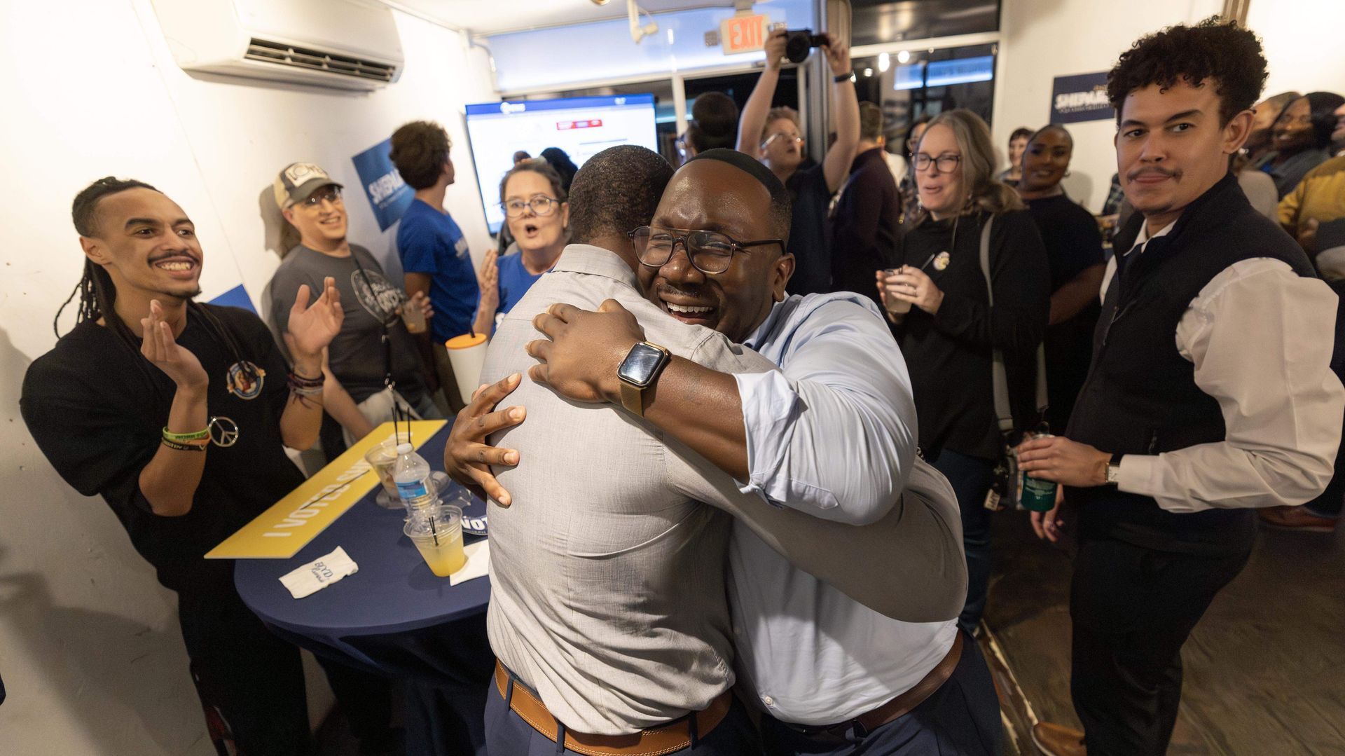 Joseph Shepard hugs incumbent District 1 City Council member Brandon Johnson after updated results showed Shepard with a sizable lead over opponent LaWanda DeShazer. Travis Heying The Wichita Eagle